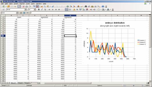 Degree of this phototactic behavior can be evaluated plotting distribution of larvae along axis of light irradiation. For this, we use "particle analysis" function in ImageJ.