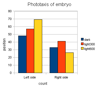 Assignment: Compare the degree of phototaxis by comparing position of larvae (1) in Dark, (2) at least three time points after light irradiation. Plot two-bar graph for dark and each time points after the light irradiation. Discuss the effect of drug treatments. If you have time, estimate the “Phototaxis Velocity”.