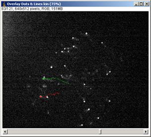 3.1.4 After tracking several larvae, show tracks by clicking “Overlay Dots & Lines”. If you think its OK, then eave the results by [File -> Save as] (menu in the Results window ) or you could directly copy and paste to spread sheet software.
