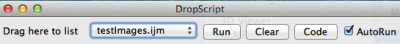 Dropped files will be appended as a list to the drop-down menu. “Clear” button will clear the list. “Code” button will open the code (Only for Javascript and ImageJ macro) in ImageJ macro editor.